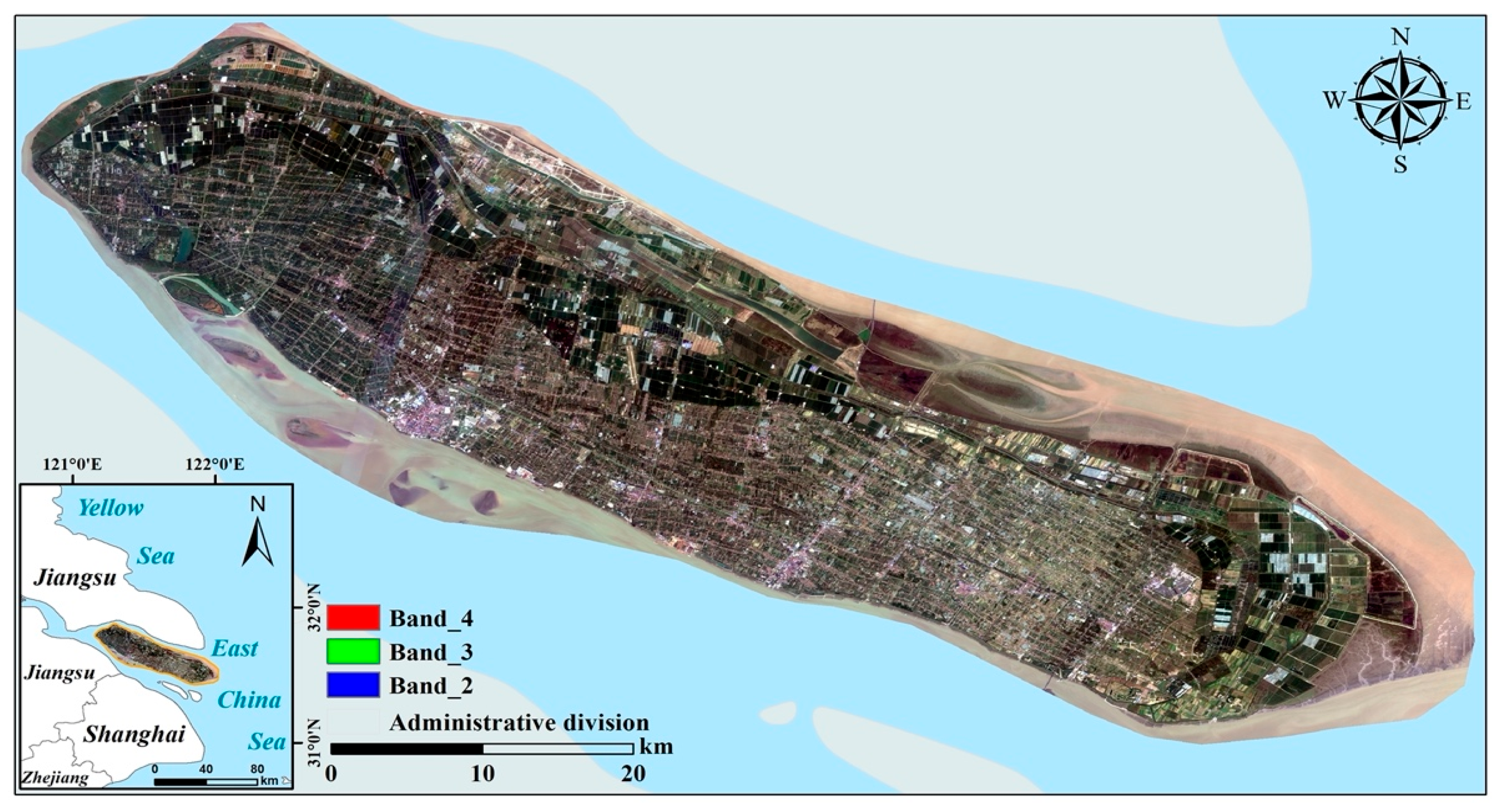 - Shen, G.; Sarris, A.; Huang, X. Remote sensing monitoring and analysis of expansion characteristics of Chongming Island in Shanghai, China. In Proceedings of the 2013 Second International Conference on Agro-Geoinformatics (Agro-Geoinformatics), Fairfax, VA, USA, 12–16 August 2013; IEEE: New York, NY, USA, 2013; pp. 556–561. [Google Scholar]