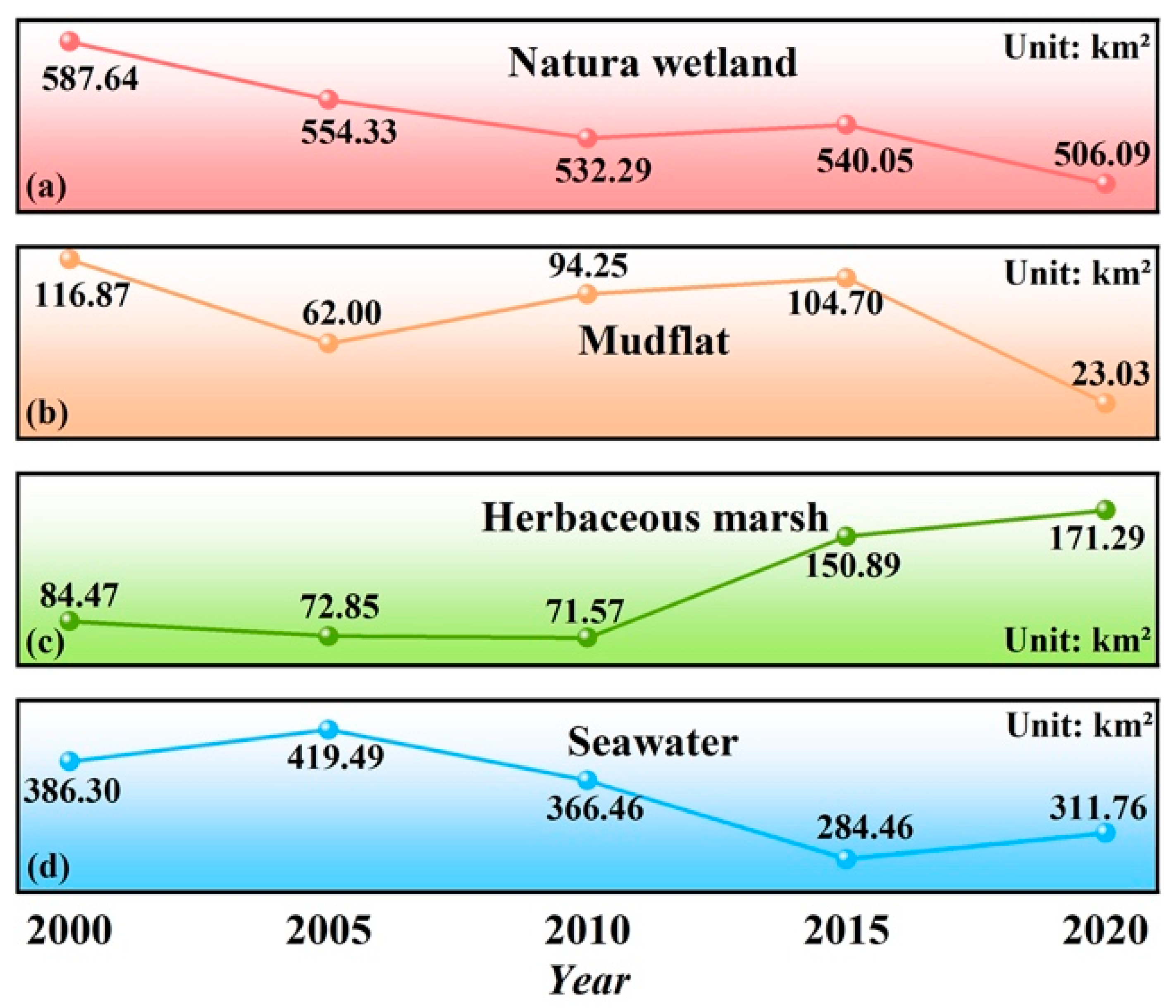 3.2. Spatiotemporal Changes in Wetlands on Chongming Island