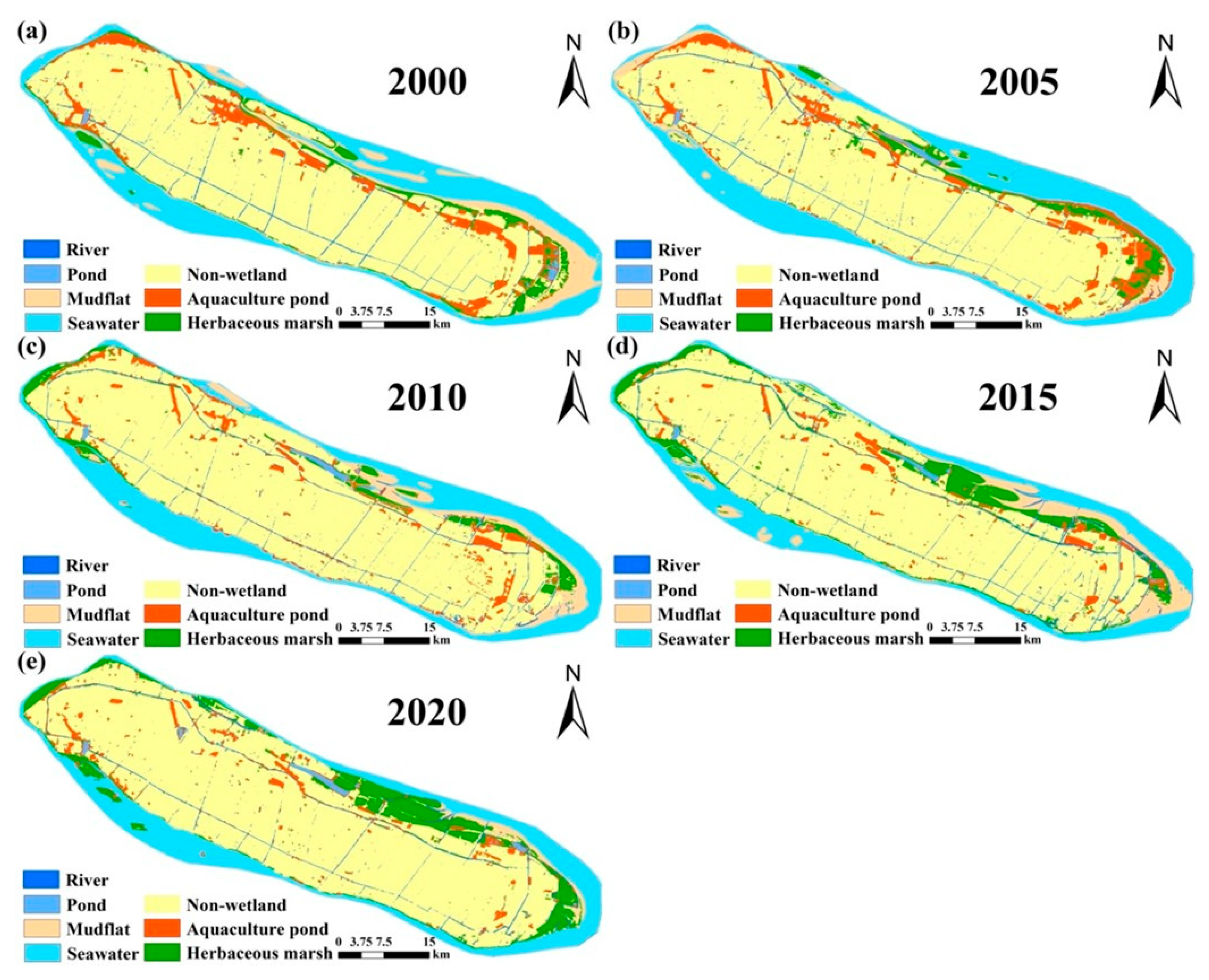 - Zhuo, W.; Wu, N.; Shi, R.; Cui, Y.; Zhang, C.; Liu, S.; Zhu, F.; Zhang, B.; Liu, P. Assessing the impacts of reclamation and invasion on ecological dynamics of coastal wetland vegetation in the Yangtze Estuary from 1985 to 2019: A case study of Chongming Island, China. J. Environ. Manag. 2025, 376, 124505. [Google Scholar] [CrossRef] [PubMed]