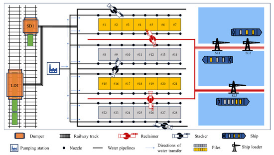 - Wang, W.; Guo, J.; Tian, Q.; Peng, Y.; Cao, Z.; Liu, K.; Peng, S. Stockyard Allocation in Dry Bulk Ports Considering Resource Consumption Reduction of Spraying Operations. Transp. Res. Part E-Logist. Transp. Rev. 2025, 193, 103816. [Google Scholar] [CrossRef]