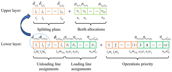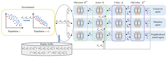 - A novel hybrid optimization algorithm is developed, which combines the global search capability of the micro-evolutionary algorithm (MEA) framework with the adaptive decision-making ability of multi-agent proximal policy optimization (MAPPO). The algorithm adopts a two-layer chromosome encoding structure to capture key decision variables such as unloading and loading line selection, ass well as operation sequence, ensuring comprehensive coverage of the solution space while reducing encoding complexity. The dominance recording matrix (DRM) dynamically extracts and records dominant gene structures from elite individuals, providing directional guidance for evolution operations. Three specialized agents for crossover, mutation, and neighborhood search perceive population states and environmental feedback, collaboratively adjust evolutionary operators in real time, and balance exploration and exploitation through adaptive strategy adjustment, enabling an efficient solution of large-scale multi-objective scheduling problems.