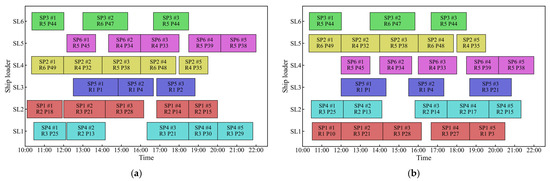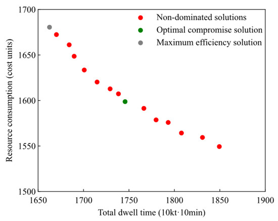 - The effectiveness and applicability of the proposed algorithm are verified through in-depth case studies and multi-scale comparative experiments. In the case study of a major Chinese coal port, two typical solutions on the Pareto front, namely the efficiency-maximizing solution and the optimal compromise solution, are analyzed in detail, and the trade-off relationship between their operational time and resource consumption is quantified, which reflects the algorithm’s ability to balance dual objectives. Moreover, comparative experiments with four benchmark algorithms on ten different scale instances show that the proposed algorithm has obvious advantages in hypervolume (HV) and inverted generational distance (IGD), which confirms its strong convergence and high solution quality in different operation scales, and fully demonstrates its practical application value.