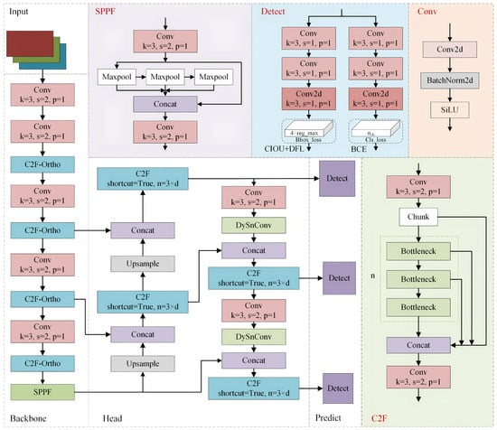 The backbone is based on an enhanced CSPDarknet53 structure, in which input features undergo five consecutive downsampling operations to produce multi-scale feature maps. Each convolutional block (Conv) consists of a convolution layer, batch normalization (BN), and a SiLU activation function. A key modification is the replacement of the original C2F module with the proposed C2F-Ortho module, which substantially improves feature representation capacity (detailed in Section 3.2). Furthermore, we employ the Spatial Pyramid Pooling-Fast (SPPF) module to aggregate multi-scale context into fixed-size outputs, thereby enabling scale-invariant processing. Compared with the traditional SPP [], SPPF significantly reduces computational overhead by sequentially applying three max-pooling layers, achieving lower latency while preserving contextual aggregation capability.