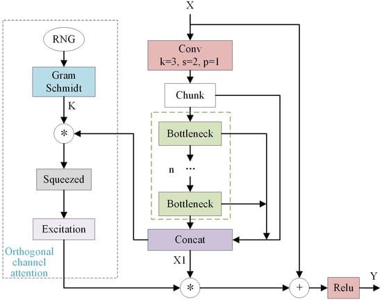 The core operation of the proposed OCA mechanism is an orthogonal linear projection within the channel–feature space. Let  denote the input feature map, where C is the number of channels and H and W are the spatial dimensions. First, we reshape  into