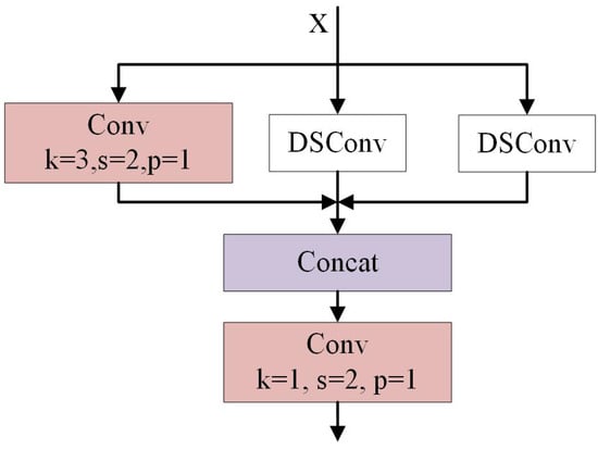 As illustrated in Figure 3, the DySnConv module processes the input feature tensor  via one standard convolution (Conv) layer and two parallel DSConv layers, thereby extracting features across three complementary receptive fields. The resulting multi-scale feature maps are concatenated (Concat) to form an enriched representation, followed by a  convolution to fuse information and adjust dimensionality. This design yields robust descriptors that simultaneously capture global context and fine-grained structural details of tubular targets.