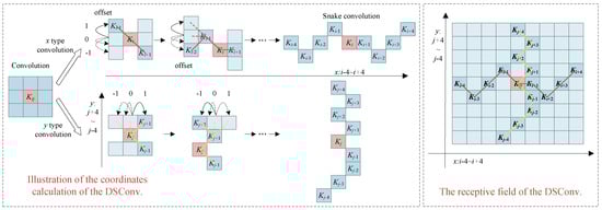 To enhance the network’s ability to model elongated and curved structures prevalent in sonar imagery, we introduce the Dynamic Snake Convolution (DSConv) within a novel DySnConv module. Unlike conventional convolutions optimized for rectangular and rigid shapes, DSConv adaptively adjusts its sampling locations along a continuous, geometry-aware path, making it particularly effective for detecting tubular targets such as submarine pipelines and marine engineering structures.