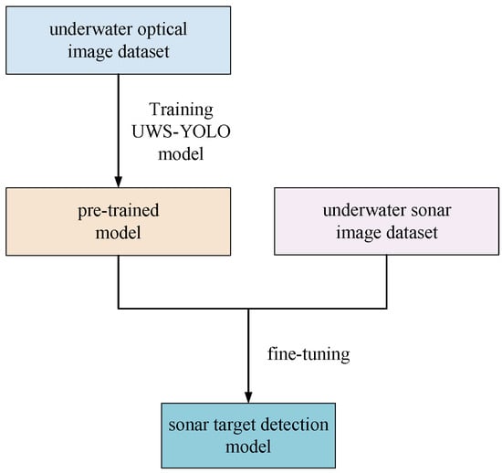 To tackle these challenges, we propose UWS-YOLO, a tailored architecture integrating three key innovations: (i) the C2F-Ortho module in the backbone, which enhances fine-grained feature extraction through orthogonal channel attention, improving the detection of small and low-contrast targets; (ii) the DySnConv module in the detection head, which adaptively models elongated and irregular geometries such as submarine pipelines; and (iii) a cross-modal transfer learning framework that pre-trains on large-scale underwater optical datasets before fine-tuning on sonar data, mitigating overfitting and narrowing the perceptual gap between acoustic and optical modalities.