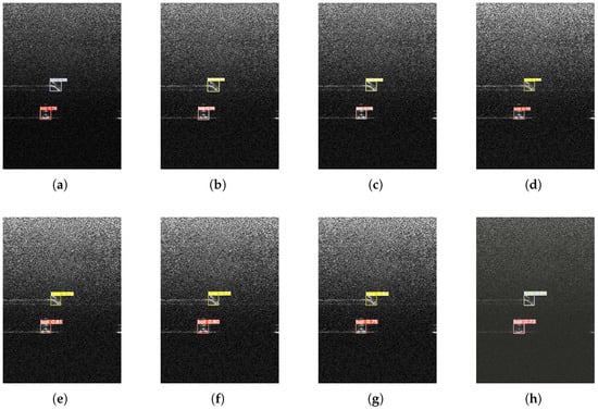 Qualitative Analysis in Scenario 1. The original images were enhanced to improve the visibility of the detection results, as illustrated in Figure 8. UWS-YOLO (Figure 8h) detects all relevant targets with tight bounding boxes and fewer missed detections compared to YOLOv5n (Figure 8a) and YOLOv8n (Figure 8e), which tend to miss low-contrast or small objects. These improvements stem from C2F-Ortho’s enhanced shallow-layer feature extraction, which boosts sensitivity to weak targets.