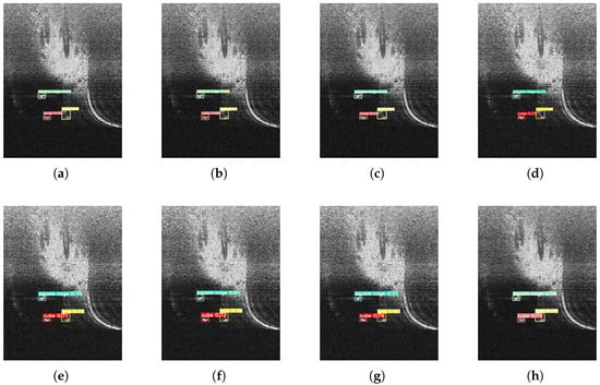 Visual comparison of detection results in scenario 1: (a) YOLOv5n; (b) YOLOv5s; (c) YOLOv7; (d) YOLOv7-CHS; (e) YOLOv8n; (f) YOLOv8s; (g) YOLOv8m; (h) UWS-YOLO.