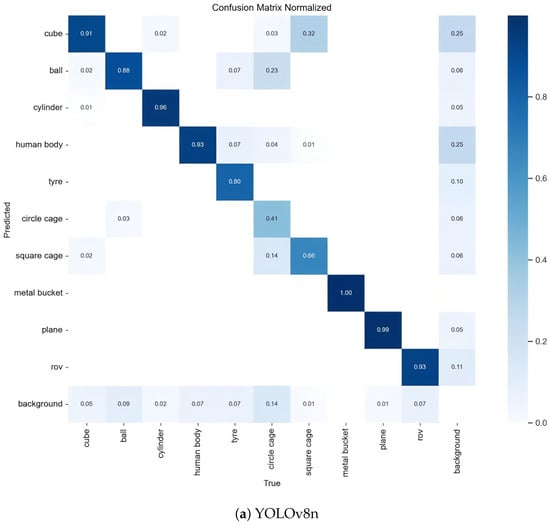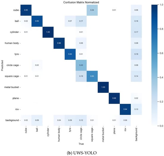 Category-Level Performance via Confusion Matrices. Confusion matrices (Figure 10) provide a detailed, category-level perspective on detection performance. The YOLOv8n matrix (Figure 10a) exhibits lighter and more scattered diagonal elements, indicating uneven accuracy across categories and a higher tendency to confuse visually similar targets. In contrast, UWS-YOLO (Figure 10b) presents darker, more concentrated diagonal patterns, reflecting higher and more consistent category-level precision. Notably, the most substantial improvements are observed for small and tubular targets, which are crucial in practical underwater tasks such as subsea infrastructure inspection and marine debris monitoring. These gains can be attributed to the synergy between C2F-Ortho’s multi-scale feature extraction and DySnConv’s adaptive shape modeling.