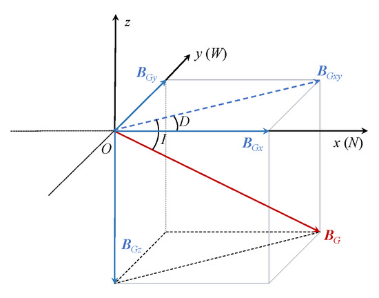 The values of the geomagnetic field vector intensity along the x-, y-, and z-axes of the coordinate system are denoted by , , and :