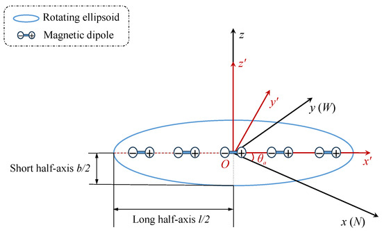 Magnetic anomalies are closely related to the inherent properties of ferromagnetic materials. The basic model for their calculation primarily consists of a combination of the FEM and magnetic body simulation. Here, the hybrid model is chosen for its accurate simulation of both the ferromagnetic shell and internal equipment’s magnetic field, offering higher calculation accuracy and efficiency. The vehicle’s hull is simplified as a rotating ellipsoidal model, where the ellipsoid’s major axis corresponds to the length (l) of the underwater vehicle and the minor axis to its breadth (b). The magnetic dipoles are evenly distributed along the central axis of the ellipsoid, as shown in Figure 3. We take the center of the dipole model as the coordinate origin, the sea level as the -plane, and the direction perpendicular to the sea plane and upward as the z-axis, establishing a right-handed rectangular coordinate system. The geomagnetic field value in the geographic coordinate system is converted to the vehicle coordinate system; the course of the vehicle is , and the westward declination is positive.