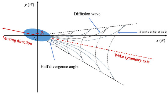 When an underwater vehicle travels at a constant speed along a path aligned with the positive x-axis in seawater, it generates free surface waves. These waves include both diffusion and transverse waves, creating a Kelvin wake as depicted in Figure 4. The most significant surface fluctuations occur within a range of 16° to 19.5° (half divergence angle) on either side of the vehicle’s trajectory, forming a V-shaped pattern overall [38].