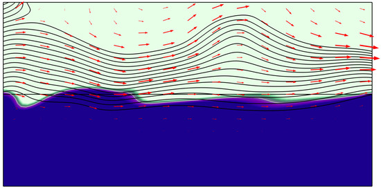 Waves are relatively common movements of seawater caused by wind, and they usually occur on the sea surface, as shown in Figure 5. The red arrows show the wind direction, with the arrow length indicating the speed of the wind field. Moreover, the direction of the black streamline fluctuations indicates the direction of ocean wave undulations, where denser streamlines indicate higher velocity. The blue coloration in Figure 5 represents the volume fraction of seawater: lighter shades denote areas with a lower volume fraction of seawater, while darker shades indicate regions with a higher volume fraction.