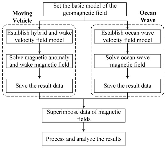 The solution process for the composite magnetic field is illustrated in Figure 6. By integrating these magnetic fields, a more comprehensive analysis of the detected magnetic field can be conducted. The composite magnetic field includes the magnetic anomaly and wake magnetic fields generated by the underwater vehicle, which are the signals of interest, and the magnetic field generated by ocean waves, which acts as noise in this context.