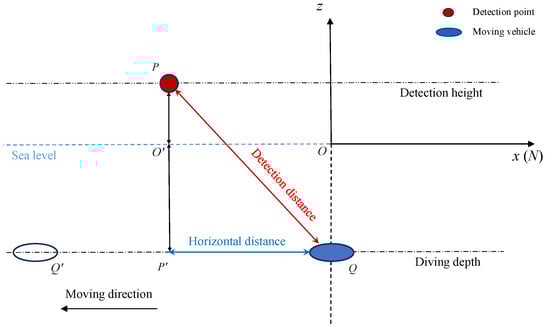 Figure 7 shows the relative positional relationship between the aircraft detection points and the moving underwater vehicle, where the blue ellipse represents the starting position of the vehicle; the diving depth is set to 80 m, and the vehicle moves at a constant speed along the route in the negative x-axis direction. The red circle represents the detection point of the aircraft, which is located at point P, and the detection height is set to 50 m.