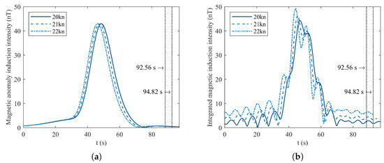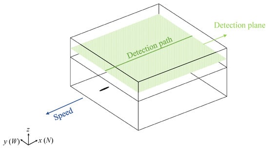 Magnetic Anomaly Detection (MAD) is widely used to identify disturbances in the geomagnetic field generated by ferromagnetic underwater vehicles [8], and is based on mathematical models categorized as mathematical theory and magnetic body methods [9]. Among the former, the Finite Element Method (FEM) calculates magnetic fields by assessing the scalar magnetic potential in finite domains, and tools such as SIMULIA Opera [10], ANSYS Maxwell [11], and COMSOL Multiphysics [12] are widely used for modeling magnetic characteristics. In magnetic body methods, a hybrid model combining a rotating ellipsoid for the hull’s magnetic signature [13] and a dipole array for the internal machinery enables efficient magnetic anomaly assessment [14]. Researchers have focused on the magnetic anomaly fields of stationary objects such as cables [15], pipelines [16], and sunken ships [17]. Under real-world conditions, vehicles usually move along certain courses at various depths [18], which directly leads to variations in the detection distance between vehicle and aircraft [19]; while this can be effectively modeled [20], the influence of a vehicle’s speed on the spatial and temporal signatures of its magnetic field remains under-studied.