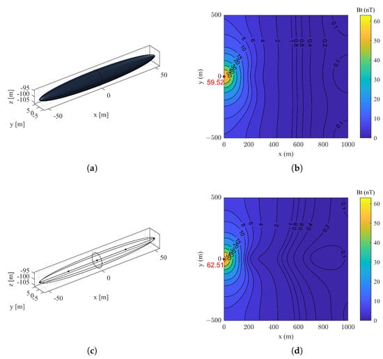 The simulations presented in the following provide a detailed examination of an underwater vehicle’s magnetic field characteristics under multiple conditions. We first address the complexities involved in modeling and analyzing the magnetic fields generated by underwater vehicles, laying the foundation for the subsequent discussion on the magnetic fields of a vehicle below a calm sea surface and the composite magnetic field of a vehicle in the presence of ocean waves.