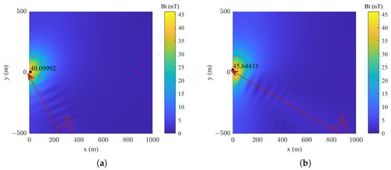The influence of different seawater electrical conductivity values along the detection path on the synthetic wake and ocean wave magnetic fields is compared in Figure 19a. Initially, up to approximately 400 m along the x-axis, the wake magnetic field is dominant, characterized by pronounced magnetic field fluctuations. Beyond this point, the ocean wave magnetic field becomes more prominent as the wake magnetic field diminishes, resulting in reduced amplitude fluctuations. Additionally, an increase in seawater conductivity slightly enhances the wake magnetic field.