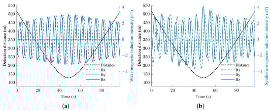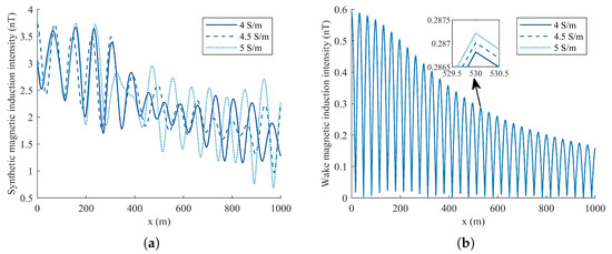 Magnetic fields under different seawater electrical conductivity values along the detection path. (a) Synthetic wake and ocean wave magnetic field. (b) Wake magnetic field.