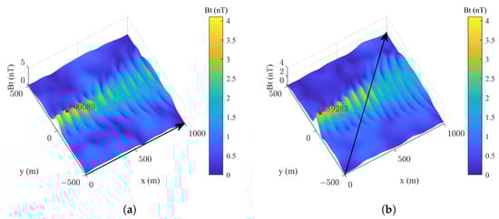 Similar to that of wakes, the magnetic field of ocean waves is also induced by the latter’s velocity field driven by the wind. By replacing the subscript w with m and the integration operation with the summation operation in Equations (20) and (23), we express the ocean waves’ magnetic field as [46]