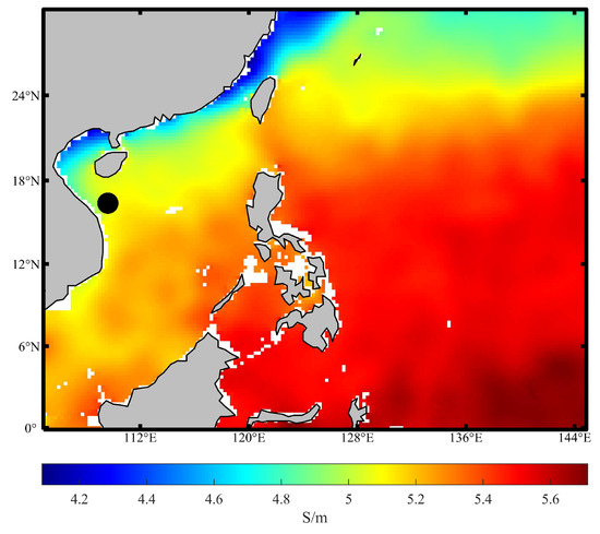 An underwater vehicle’s radiated magnetic field is influenced not only by ocean waves but also by seawater electrical conductivity. The distribution map of seawater electrical conductivity in a specific area (105°–145° E and 0°–30° N) is shown in Figure 18, with the sea depth set to 10 m. The map illustrates that electrical conductivity generally increases as latitude increases, transitioning from lower values (indicated by blue) near the equator to higher values (indicated by red) towards the northern part of the map. Similarly, there is a gradient of conductivity with longitude, with values increasing from west to east. This suggests that the geographical location significantly affects seawater conductivity, which in turn can influence the characteristics of magnetic fields generated by underwater vehicles when sailing in different sea areas.