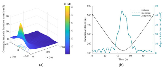 In Section 2, we presented the magnetic anomaly field of an underwater vehicle and the comprehensive characteristics of the wake magnetic field and, in Section 3, the characteristics of the wave magnetic field and its influence on the wake magnetic field. Therefore, the composite magnetic field measured on the detection plane is obtained by combining the magnetic anomaly, wake, and ocean wave magnetic fields, as shown in Figure 20. Compared with the condition of a calm sea surface, it can be seen that ocean waves slightly alter the shape and distribution of the magnetic field around the vehicle, indicating that wave conditions can modulate the magnetic signatures detected by sensors. Notably, the standard deviation in fluctuations in both the composite and integrated magnetic fields is approximately 0.3741 nT, as illustrated in Figure 20b, indicating that the impact of ocean waves on the magnetic field of the vehicle is relatively minor under sea state Code 3. However, as the sea condition level increases, the influence of waves on the magnetic field generated by the underwater vehicle becomes increasingly significant.