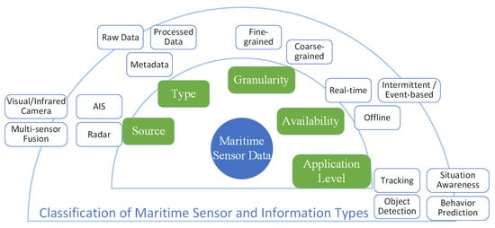 Image correction is one of the core steps of SAR image processing, including geometric correction and radiometric correction. Geometric correction is mainly used to eliminate the image distortion caused by sensor attitude, orbital perturbation, curvature of the Earth, or terrain undulation, etc., so that the image can correctly correspond to the geographic coordinates. Radiometric correction is used to calibrate the sensor response or eliminate atmospheric effects, so that the remote sensing image can truly reflect the radiometric properties of the ground. In the display and interaction of remote sensing images, large data volume, high resolution, and various formats become the main challenges. In addition to radar image data, there are point data and track data acquired by the radar. Point data is the information that the shipboard radar extracts from the target (obstacle or ship) such as its relative azimuth, relative distance, and reflection intensity. Trajectory data includes target identifier, target distance, bearing, speed, heading, nearest time, and space. The two different types of data depend on the different radars selected for different ships [19]. Also, we focus on all the main types of ship data in recent years and classify the extracted data. Figure 2 shows the classification framework for maritime multi-data types. Fine granularity refers to the resolution of data in terms of time or space. Availability refers to whether the data is easily accessible, with the main reason for inaccessibility being privacy concerns.