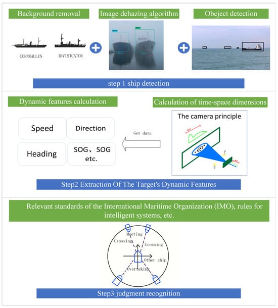 Collision avoidance on water for ships is defined as a process of sensing, evaluating, and making decisions on objects encountered in ship navigation through data means, which is a core part of current water navigation safety. The study of water collision avoidance of ships can provide assistance for the safe driving of all types of ships including manual driving. More importantly, it will provide safety and technical support for unmanned autonomous ships on water. Currently, the research focuses on the water sensing of ships and its corresponding judgment. Sensing is based on a wide range of data sources, including the AIS, radar, and image data to sense obstacles. Judgment is usually based on the International Collision Avoidance Rules at Sea (COLREGs), relevant standards of the IMO, and rules of intelligent systems (such as risk perception algorithms based on images, radar, and the AIS), etc., to make the corresponding avoidance measures such as turning direction, slowing down, and accelerating, etc., for the existence of the ship. This process is shown in Figure 3 (Black boxes indicate the detected ships in the image.).