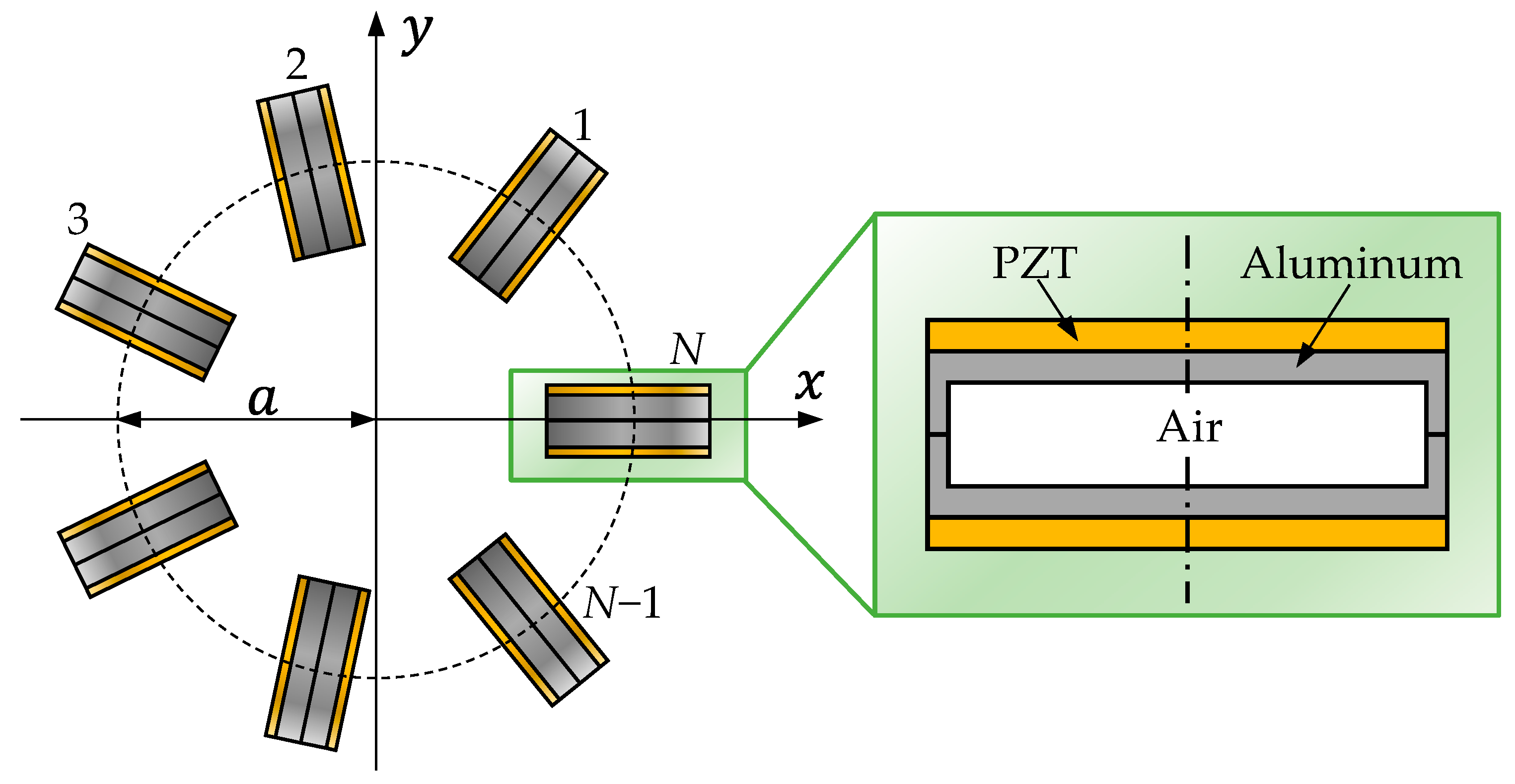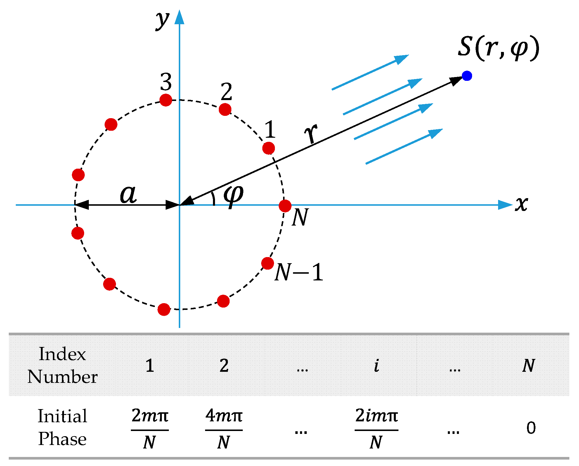 Figure 3; hence, it can be regarded as a point sound source in the preliminary analysis. Thus, based on point sound source approximation, the transmitting array was modeled using a simple circular array (SCA) model, which was established in our previous work [
