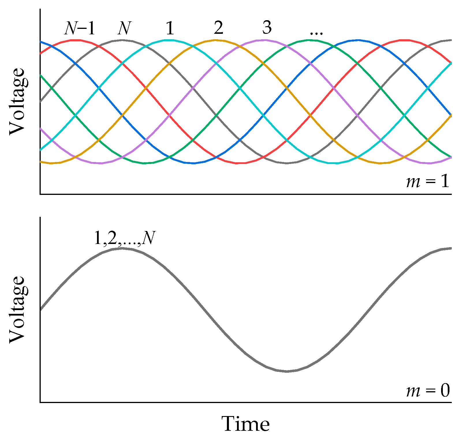 , it generates spiral wavefronts exhibiting a linear phase variation with azimuth at a 1:1 ratio. An example of the driving signal configuration is illustrated in