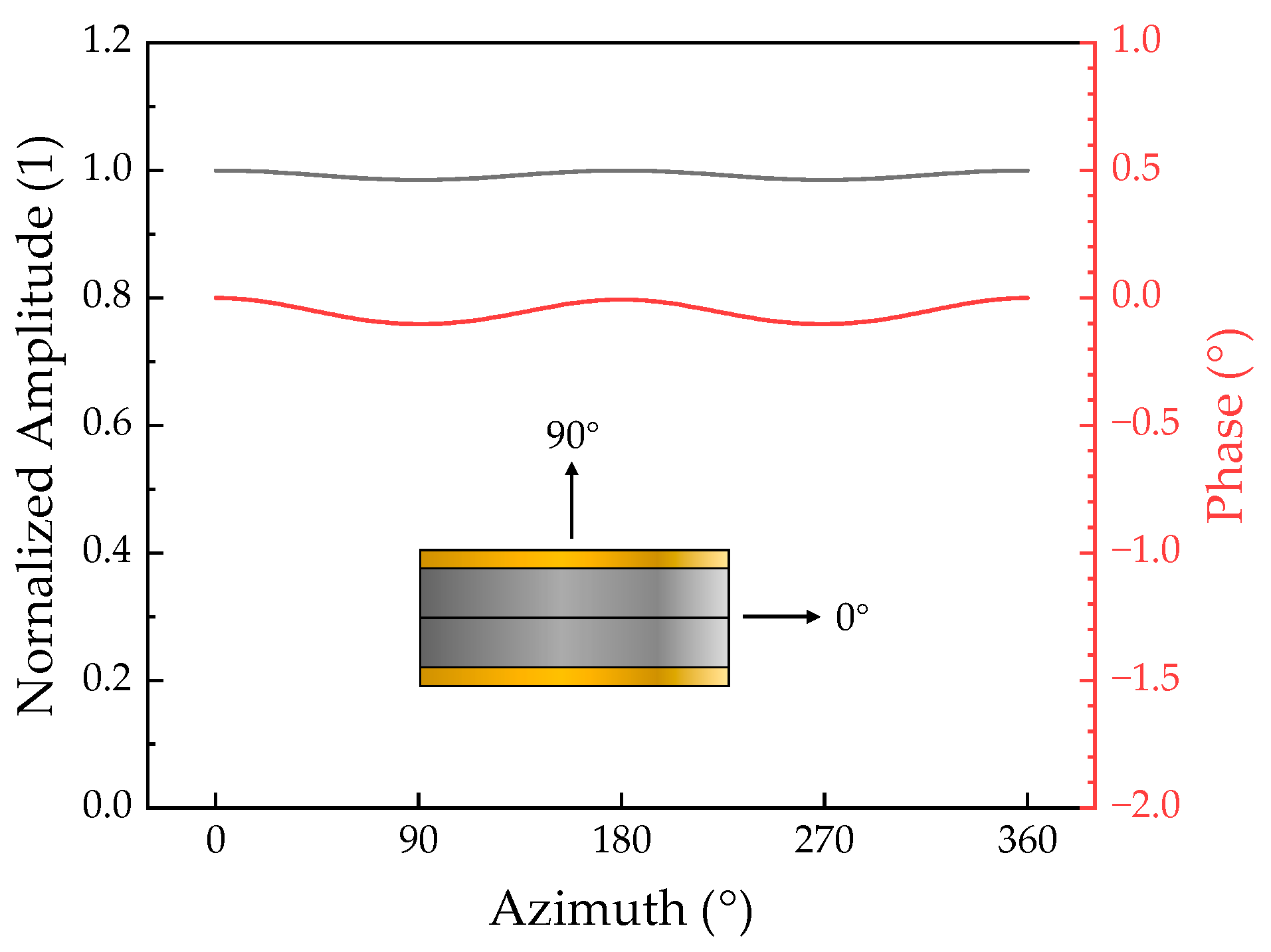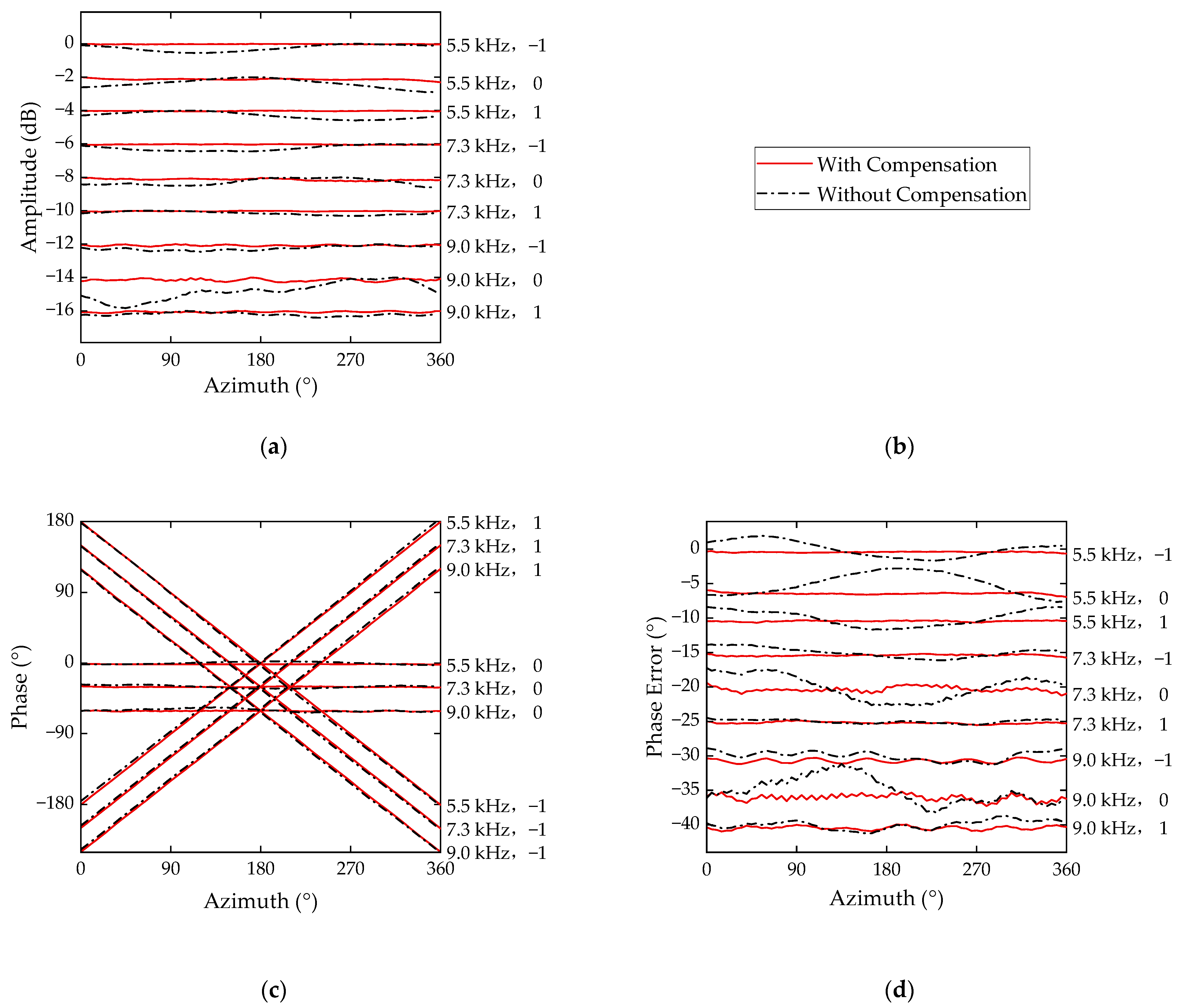 value were obtained. Then, phase and amplitude directionality test were conducted with three frequencies, i.e., the resonance frequency, one above, and one below. The rotator was set to have a 5° step for all the directionality tests. The signals were continuous wave (CW) pulses with a 2 ms pulse width. The phase and amplitude data were converted using a fast Fourier transform (FFT). Finally, a phase error compensation experiment was subsequently condected with a test voltage matrix,