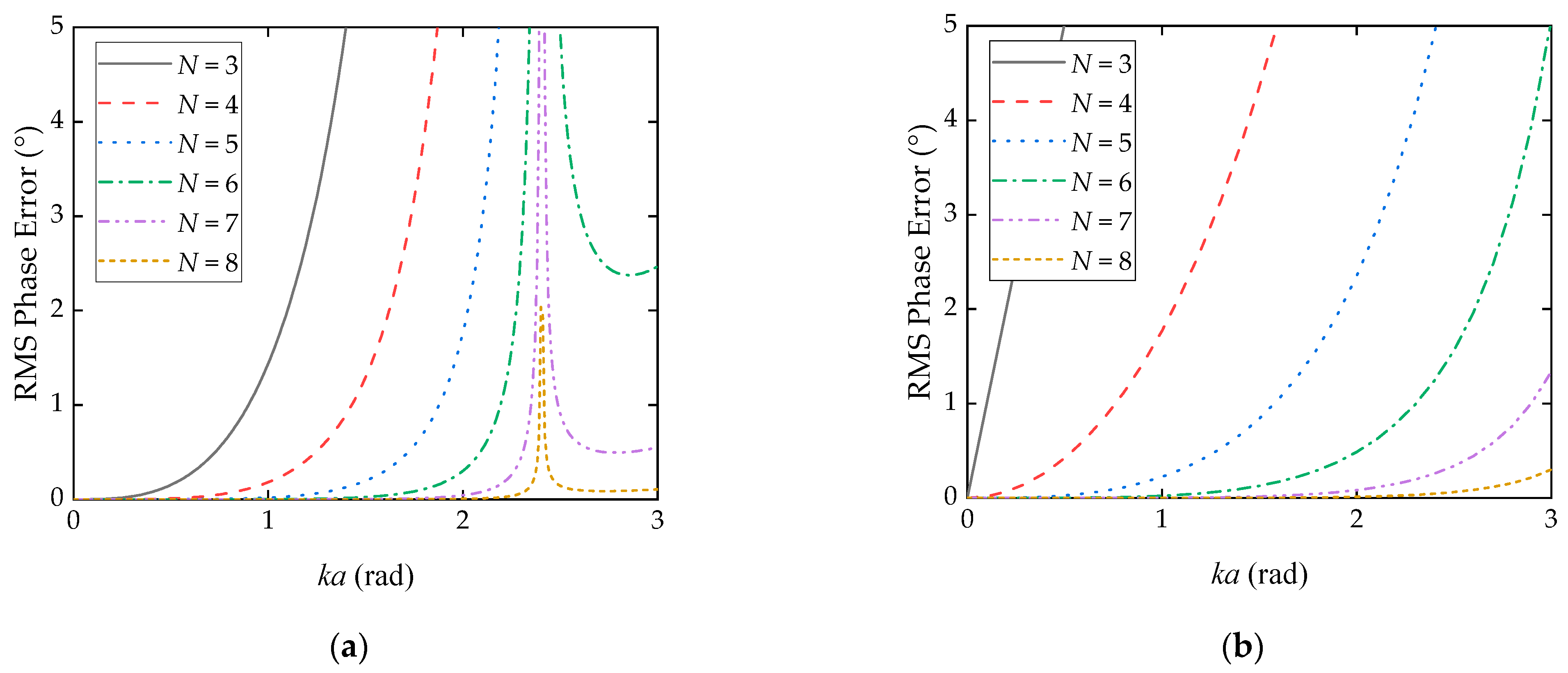 The optimization process was designed to balance the selected performance indicators while accounting for practical constraints such as manufacturing feasibility and cost-effectiveness. Notably, although the number of the array elements exerts a proportional influence on the amplitude levels of both wavefronts, it has a significantly larger impact on the phase error. Therefore was excluded from the amplitude response design phase. Instead, the product of the wave number and array radius, , was optimized to ensure both wavefronts exhibit equal and sufficiently high amplitude levels. Subsequently, the value of was selected to achieve a sub-degree-level phase directionality error, thereby satisfying the accuracy requirements defined by the design indicator.
