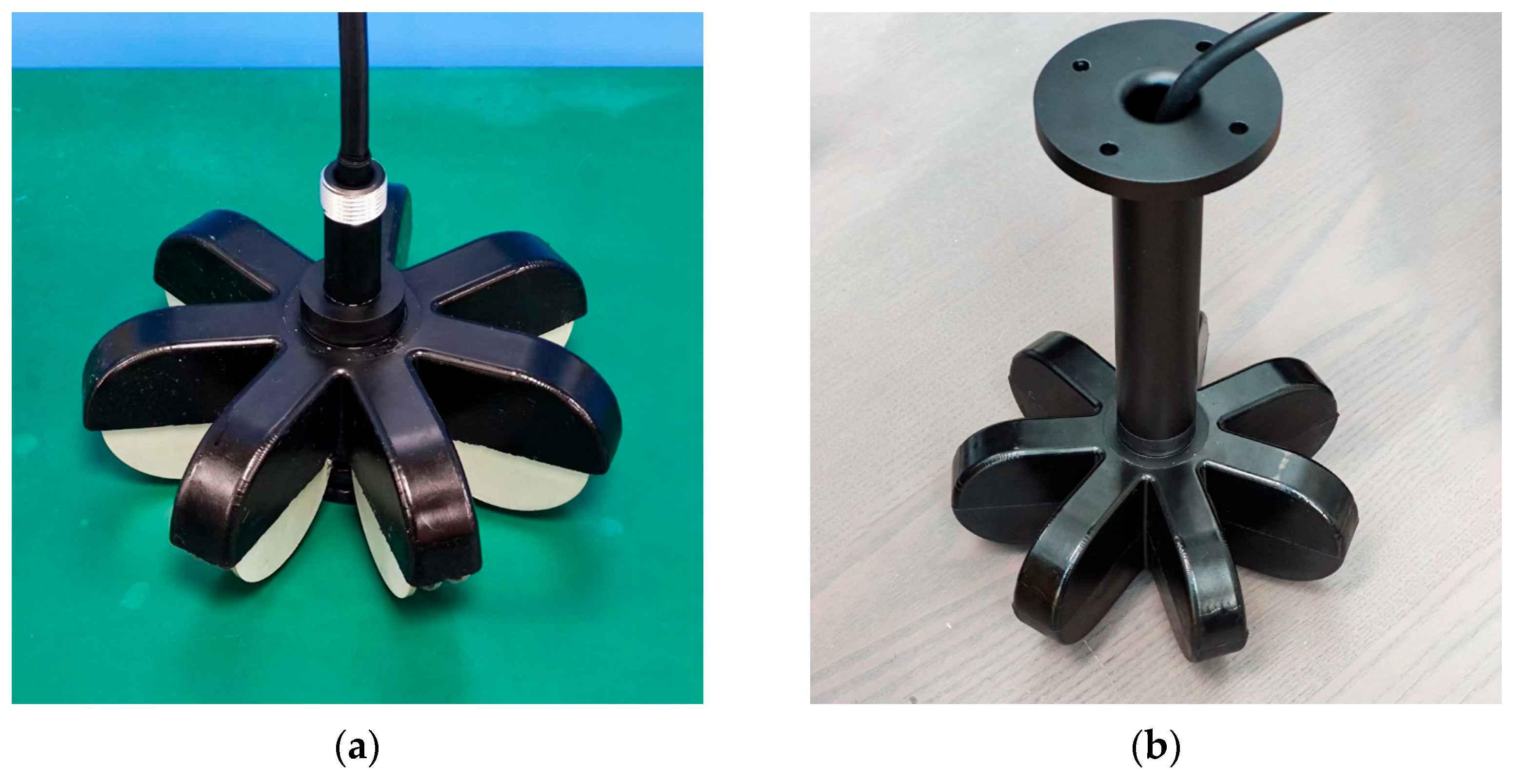 The fabrication process began with the fabrication of the bender disk elements; the piezoelectric materials and metal disks were bonded using epoxy resin. Then, the electrodes of the transducer elements were soldered to a watertight cable, and the cable was routed through the hollow array support to avoid asymmetric scattering. The elements share the negative electrode but have individual positive electrodes. Finally, the array was potted into a whole piece by two steps of half potting using a customized mold.