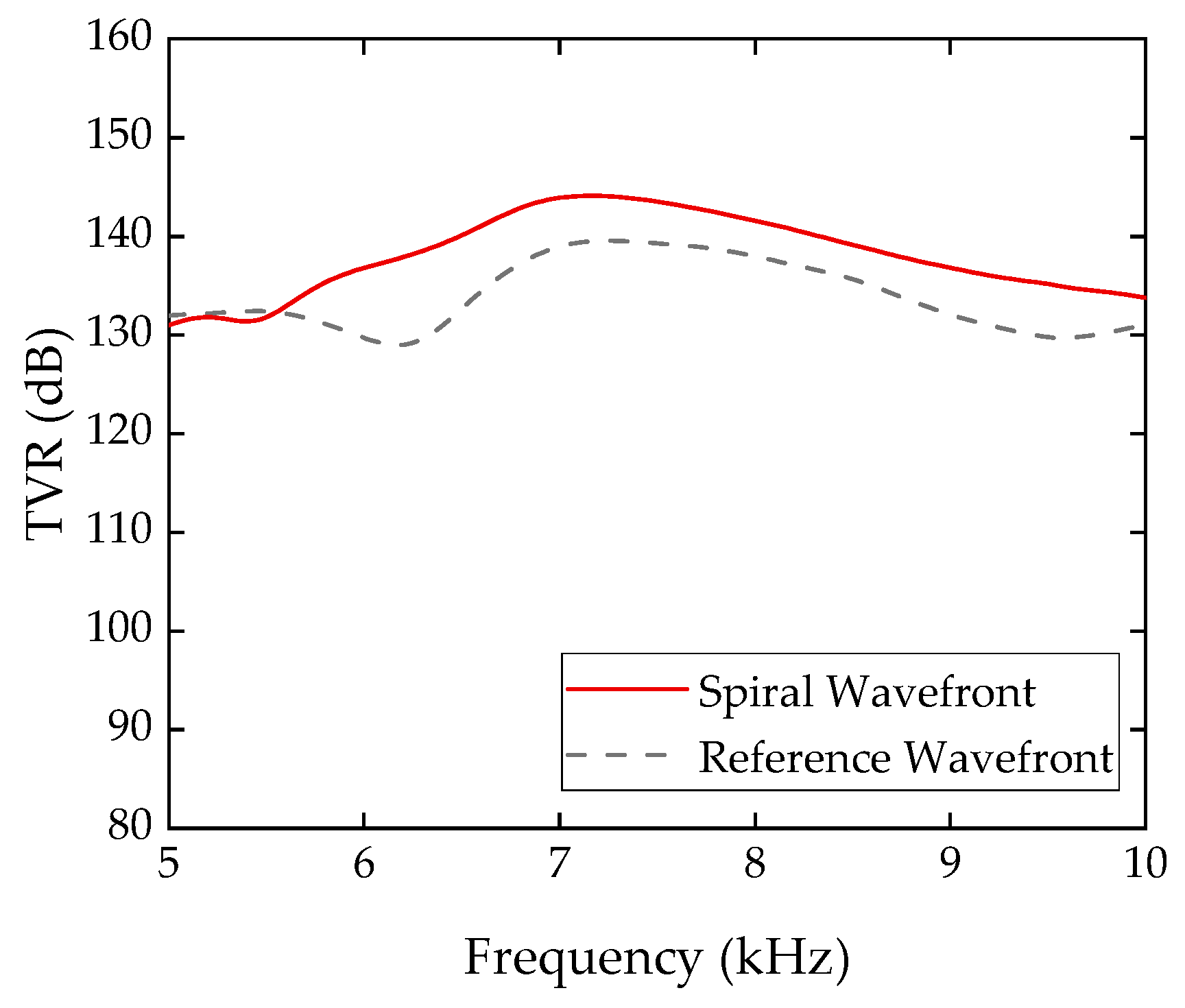 Experimental validation was conducted in a water tank experiment using an array prototype comprising seven bender disk transducers. The prototype, with dimensions of Φ156 mm × 56 mm at the outer edge of the transducers, was driven by a seven-channel signal. The test results confirmed the array’s capability to effectively emit both spiral and reference wavefronts in an underwater environment. At the resonance frequency of 7.3 kHz, the array achieved peak transmitting voltage response (TVR) values of 144.1 dB for spiral wavefronts and 139.5 dB for reference wavefronts. The compensation method demonstrated significant improvements in both amplitude uniformity and phase directionality accuracy across all the tested frequencies. Specifically, the compensated amplitude directivity variation remained below 0.3 dB, while the RMS phase error was reduced to a range of 0.09–0.51°.
