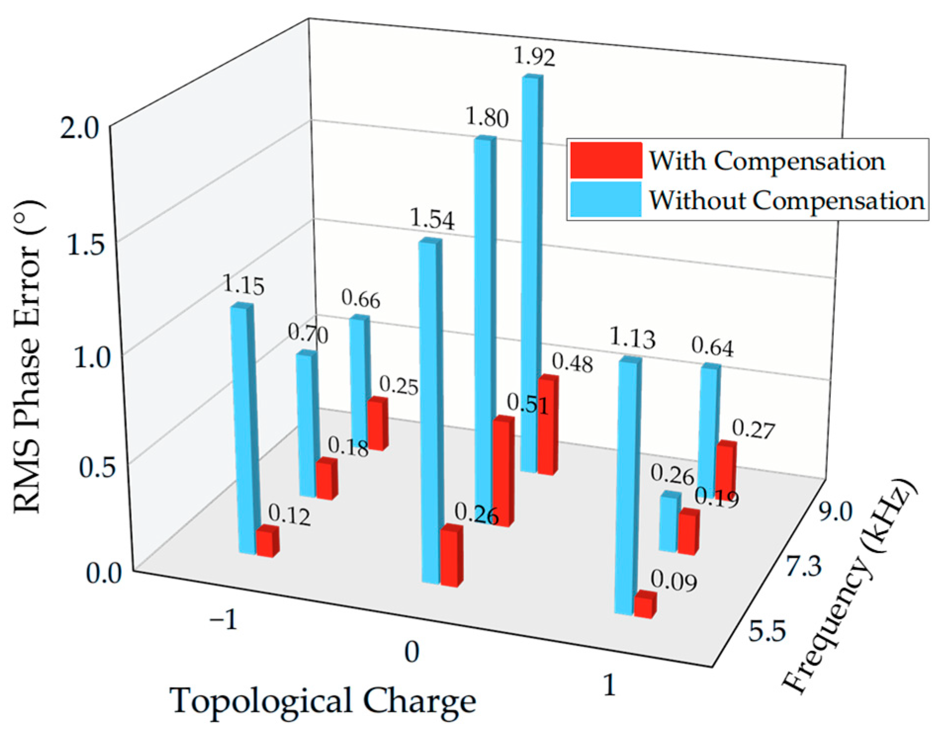 The phase error, characterized by its root-mean-square (RMS) value of the phase error according to the azimuth, is a result of non-desired ASWFs interference with topological charges of