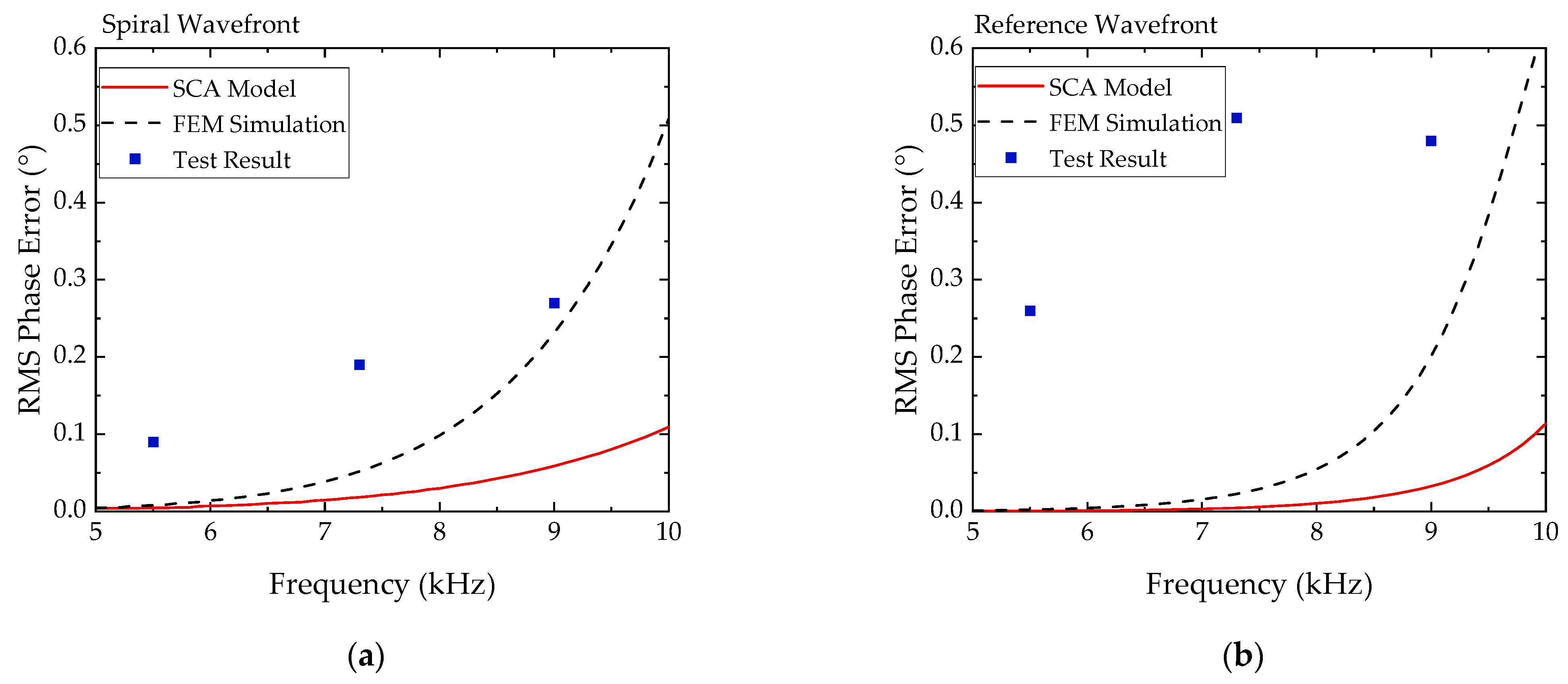 , the smaller the phase error of the array. According to the curves, if the RMS value of phase error remains below 1° at