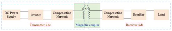 The UIWPT system operates on the principle of Faraday’s law of electromagnetic induction, facilitating wireless power transfer via electromagnetic coupling between the primary and secondary coils [37]. The system primarily comprises a power supply unit, high-frequency inverter, resonant compensation network, magnetic coupler, and rectification and filtering circuit. An illustrative schematic of the system architecture is presented in Figure 1.