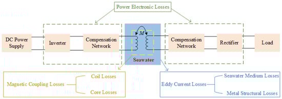 The efficiency of UIWPT systems is a key performance indicator in underwater applications, where electrical energy is scarce and enhancing energy transfer efficiency is particularly essential. In AUV-based UIWPT systems, power losses primarily originate from the magnetic coupler, power electronic components, and eddy current effects. The distribution of these losses is shown in Figure 2.