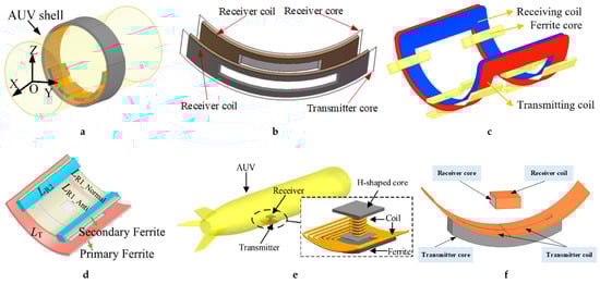 Yan et al. [66] proposed a base-alignment magnetic coupler utilizing an EE-type magnetic core, in which the secondary and primary sides are positioned on the underside of the AUV and the subsea base station, respectively. The windings are arranged around the central magnetic limb, thereby improving the coupling coefficient and enhancing the power transfer capability of the system. In further research, Cai et al. [67] proposed an optimized -type magnetic core design, featuring a bottom surface with improved conformity to the curved profile of the AUV hull. Through parameter optimization and iterative refinement, simulation results under misalignment conditions demonstrated that the -type core exhibited significantly enhanced coupling performance compared to the conventional E-type core configuration. In addition, a study presented in [49] introduced an anchor-shaped magnetic core structure with an enlarged curved contact surface, significantly improving geometric conformity with the AUV hull. This design enhanced coupling performance and exhibited increased tolerance to angular misalignment (Figure 3c).