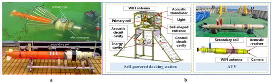 As exploration missions grow in complexity and duration, the energy demands of AUVs have increased significantly. Currently, AUVs rely on on-board energy storage [4,5]. However, because of limitations imposed by the size and weight of on-board devices, their battery capacities are insufficient to support long-duration and high-performance operations, thereby necessitating external energy replenishment [6,7]. Traditional energy replenishment methods include shore-based recovery charging [8] and underwater docking through wired connections [9,10]. The former requires frequent manual intervention, leading to decreased operational efficiency and elevated costs and risks [4]. The latter approach employs wet-mate connectors for power transfer, which enhances the long-term underwater residency capability of AUVs but remains constrained by corrosion susceptibility and limited mating cycles. Repeated usage can result in electrical faults, reduced equipment reliability, and high maintenance costs [11,12].