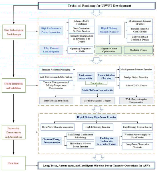 In response to these challenges, this paper offers a comprehensive review of recent developments and technological trends in UIWPT systems for AUV applications. The structure of this paper is as follows: Section 2 introduces the system architecture and operating principles of UIWPT, together with an analysis of energy loss mechanisms in underwater environments and their corresponding optimization strategies. Section 3 provides an in-depth review of key technical advancements, including magnetic coupler design, compensation circuit topologies, control strategies, simultaneous power and data transfer, and eddy current loss analysis. Section 4 discusses representative integration cases of UIWPT systems on AUV platforms and evaluates their performance. Section 5 focuses on the engineering application requirements and systematically examines the critical challenges encountered during real-world implementation. Section 6 discusses development trends in UIWPT technology to support continued innovation and facilitate its application in deep-sea operations. Finally, Section 7 presents the conclusions.