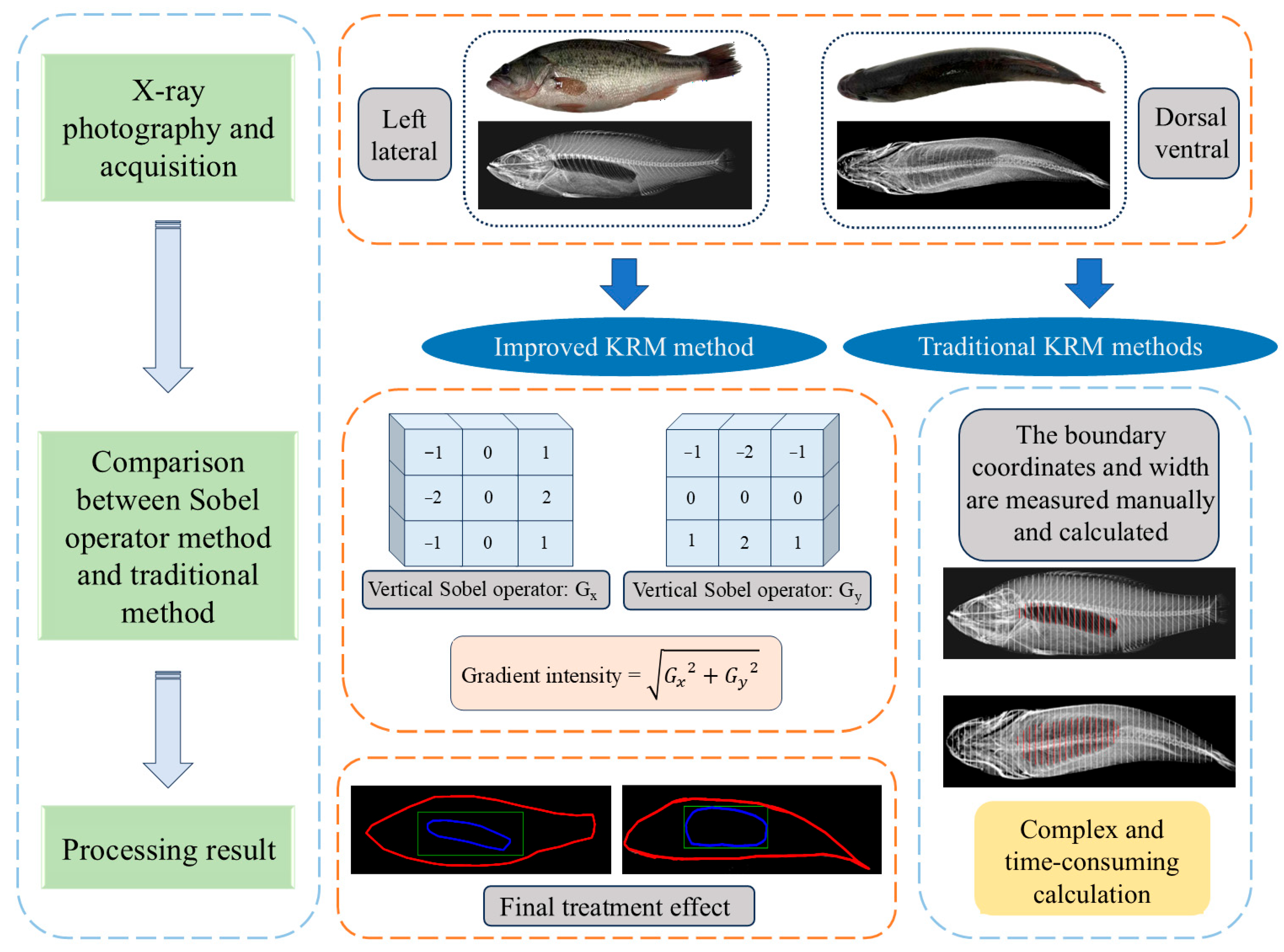 - Edge Detection and Separation. Utilizing edge detection algorithms, the X-ray images were processed in software to precisely separate the fish body and swim bladder regions. This step involved identifying high-gradient areas within the images to extract the boundary contours of both the fish body and the swim bladder.