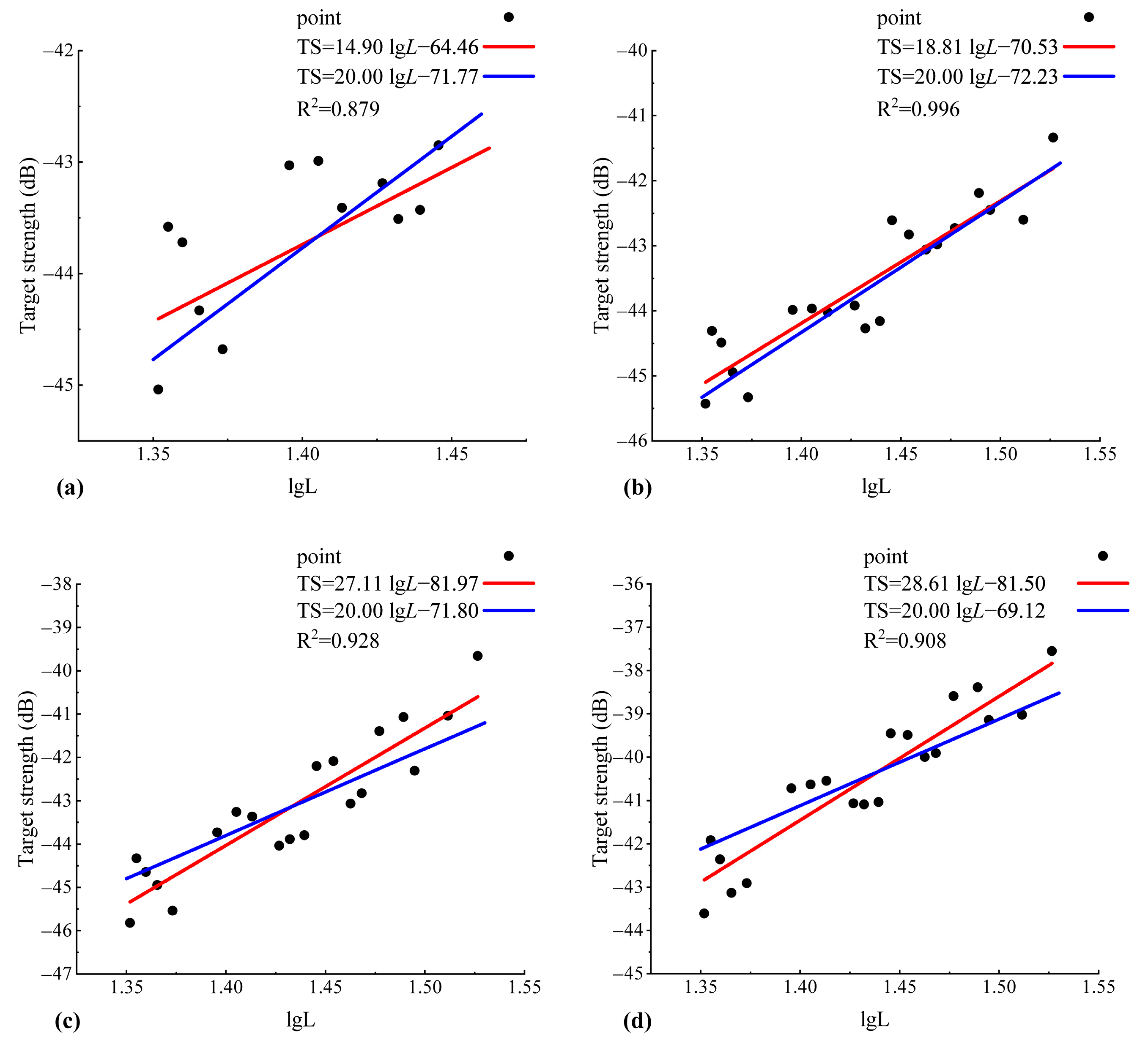 - Target Strength Calculation and Acoustic Scattering Analysis. Based on Equations (1)–(8), the target strength of each fish was calculated. Furthermore, acoustic scattering characteristics were analyzed to evaluate the reflection and scattering effects of fish bodies on sound waves.