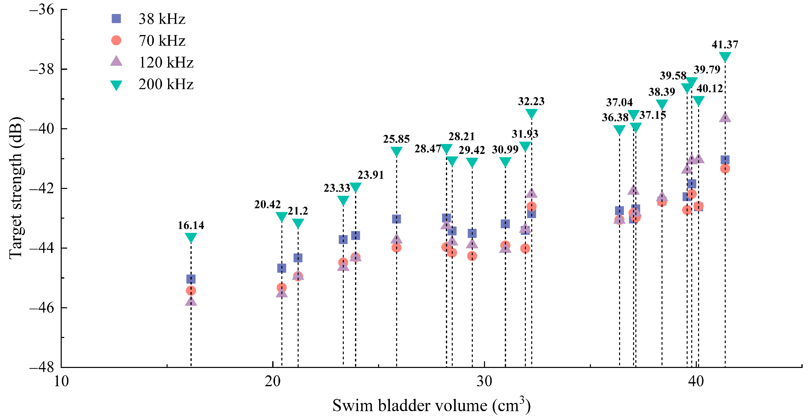 3.2.2. Relationship Between Target Strength and Swim Bladder Volume