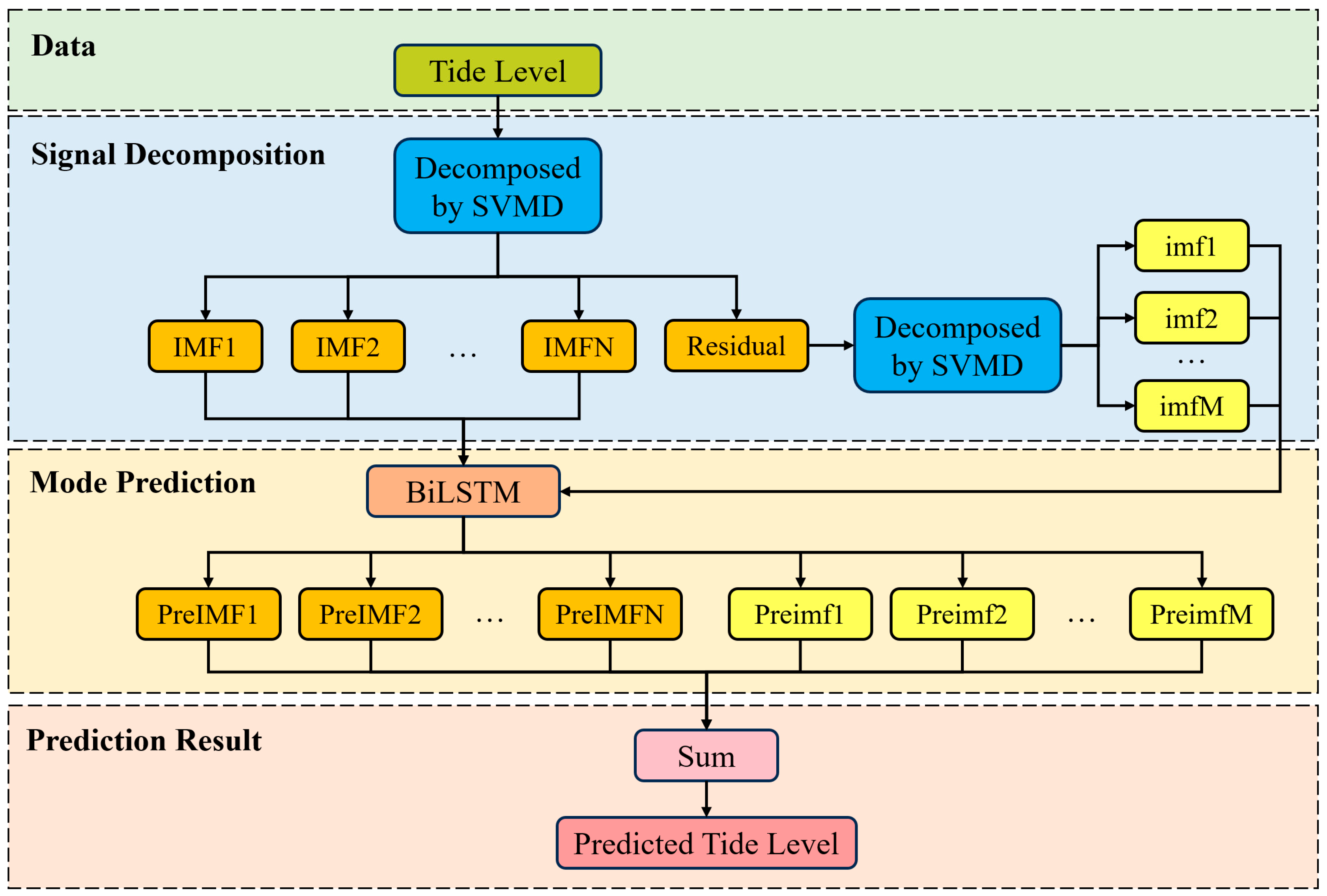 This study focuses on Venice, a city with complex tidal conditions, as the subject of research. The aim is to address issues such as high redundancy, heavy reliance on extensive historical tidal data, and incomplete consideration of influencing factors in existing tidal forecasting methods. To achieve this, a hybrid tidal prediction model called SVMD-BiLSTM-Residual Decomposition (SBRD) is proposed. SBRD is an ensemble model. The SBRD model utilizes SVMD to decompose the original tidal level data into simpler, more stationary sub-signals with clear physical significance. This simplifies the complexity of tidal signals, incorporates tidal variations caused by different factors into the analysis, and helps the neural network better understand and learn the tide signals. The difference between the sum of the decomposed sub-signals and the original data is known as the residual, which still contains signals that affect tidal levels. Therefore, SVMD is also applied to the residual to extract useful signals embedded within it. The BiLSTM network is then used to perform multi-scale feature extraction and independent prediction for each sub-signal. The final tidal level prediction is obtained by combining the predicted components, resulting in high-accuracy tidal forecasting.
