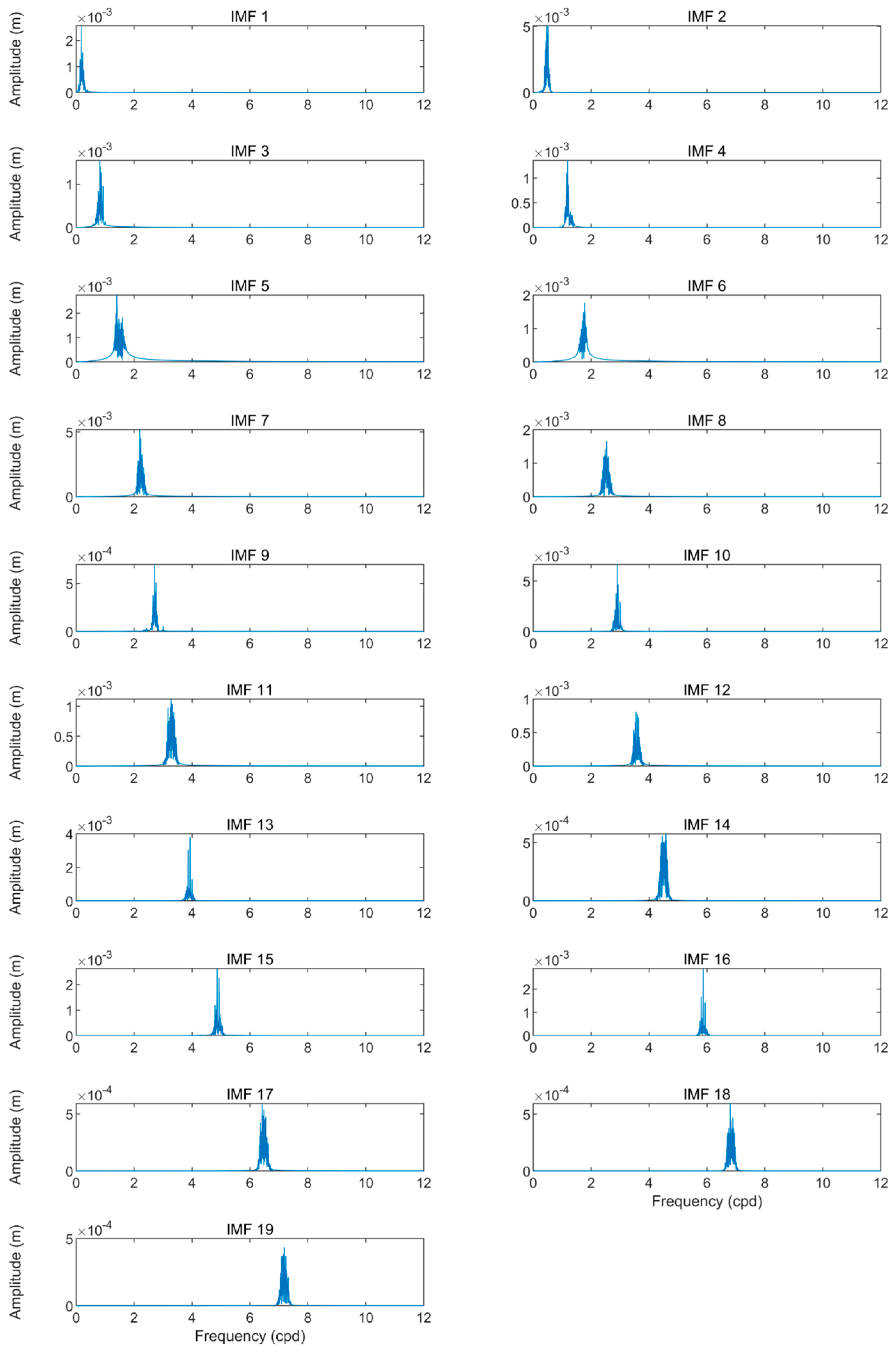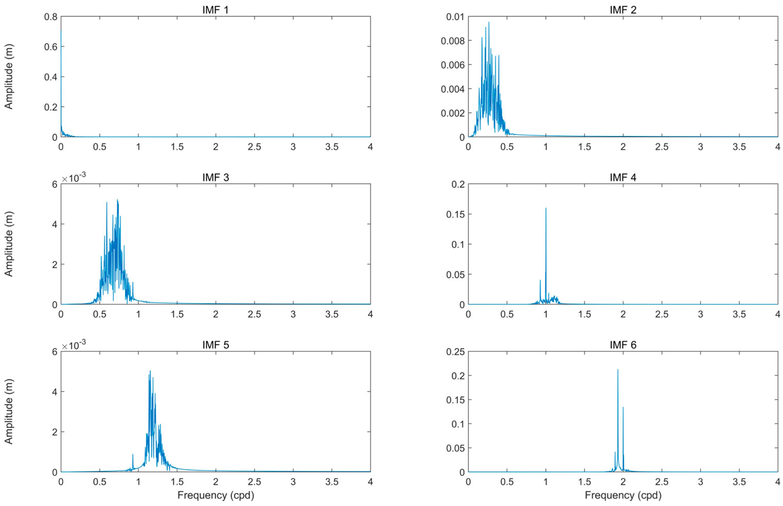Figure 10 show the Fourier spectra of the original signal modes and residual modes, respectively. The spectra clearly indicate that oscillations at different time scales are strictly separated into different modes, with no mode mixing observed. This suggests that SVMD has successfully extracted the complex tidal features.