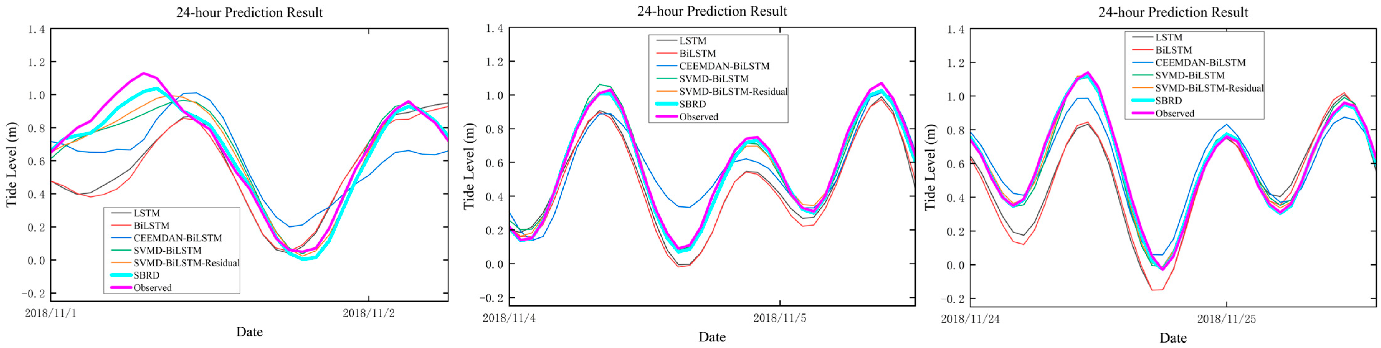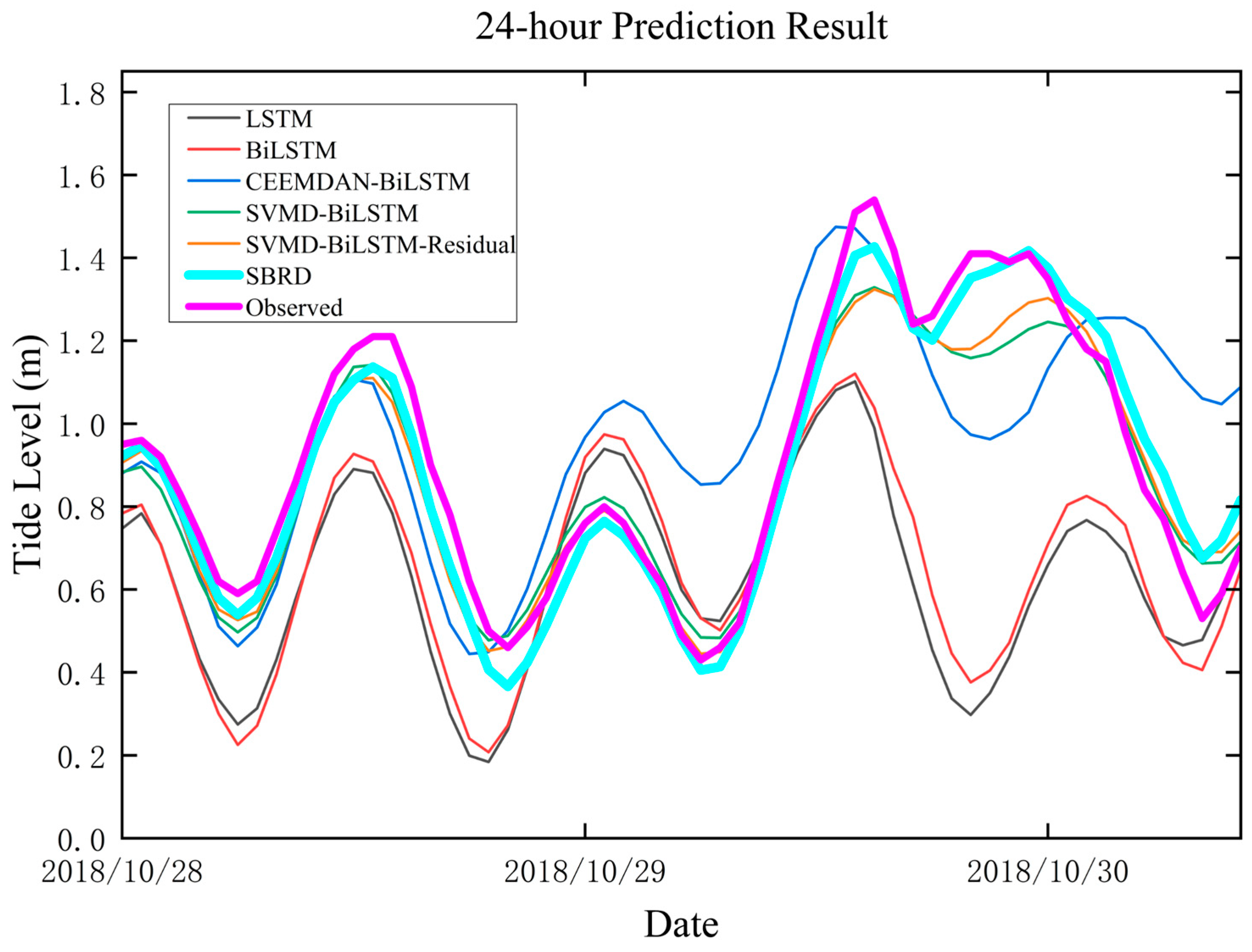 Table 5 displays the evaluation metrics for the tidal prediction results at the 24th hour. Out of the six models, SBRD demonstrates the highest accuracy and the smallest errors, with an R