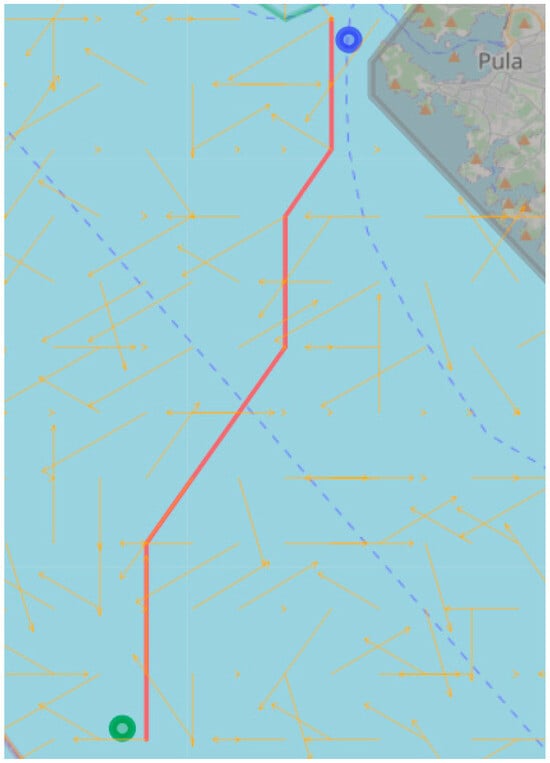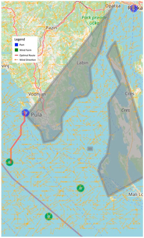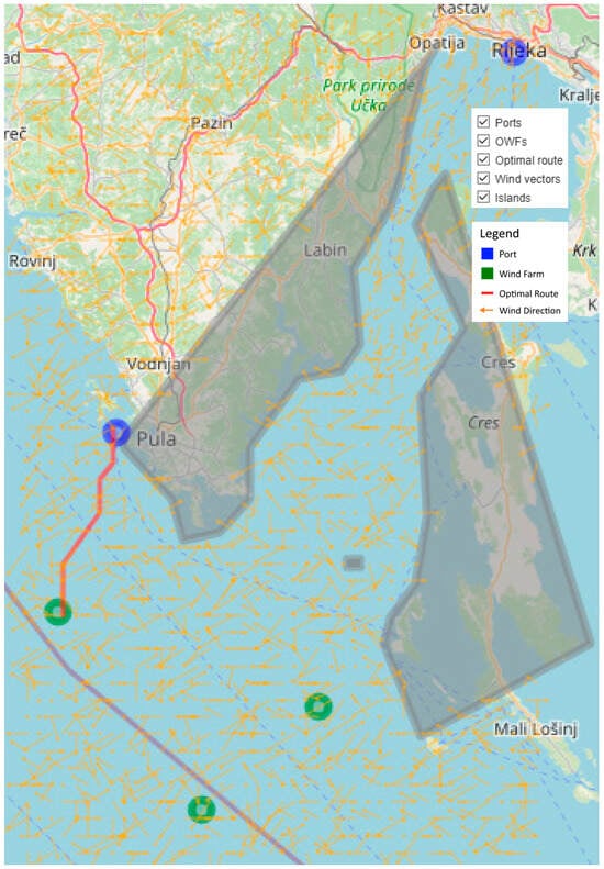 Although the paper emphasises “empirical validation” and “dynamic wind integration”, the specific innovation compared to previous studies is the following: In contrast to previous studies relying on theoretical models, simulations or generic networks, this study applies Dijkstra and A*’s algorithms directly in real maritime conditions between the ports of Pula and Rijeka, involving two ports, three onshore obstacles (mainland and islands) and three OWF. With this approach, the performance of the algorithms is empirically evaluated in a real environment, including actual wind conditions and geometric obstacles that were largely ignored in previous studies.