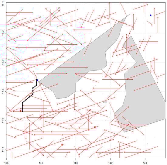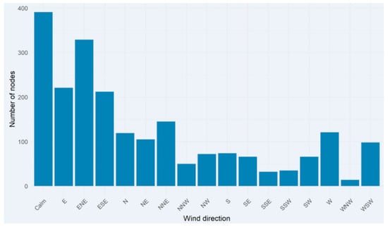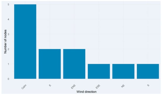 The analysis of the wind conditions shows that calm sequences indicate zones with no wind influence, while segments with increased wind speed (e.g., 4.8 m/s at coordinates 44,883, 13,773, and 44,823, 13,753,) significantly influence the selection of the optimal route. The histogram of wind directions (Figure 7) clearly visualises the frequency of the individual directions and facilitates navigation planning.